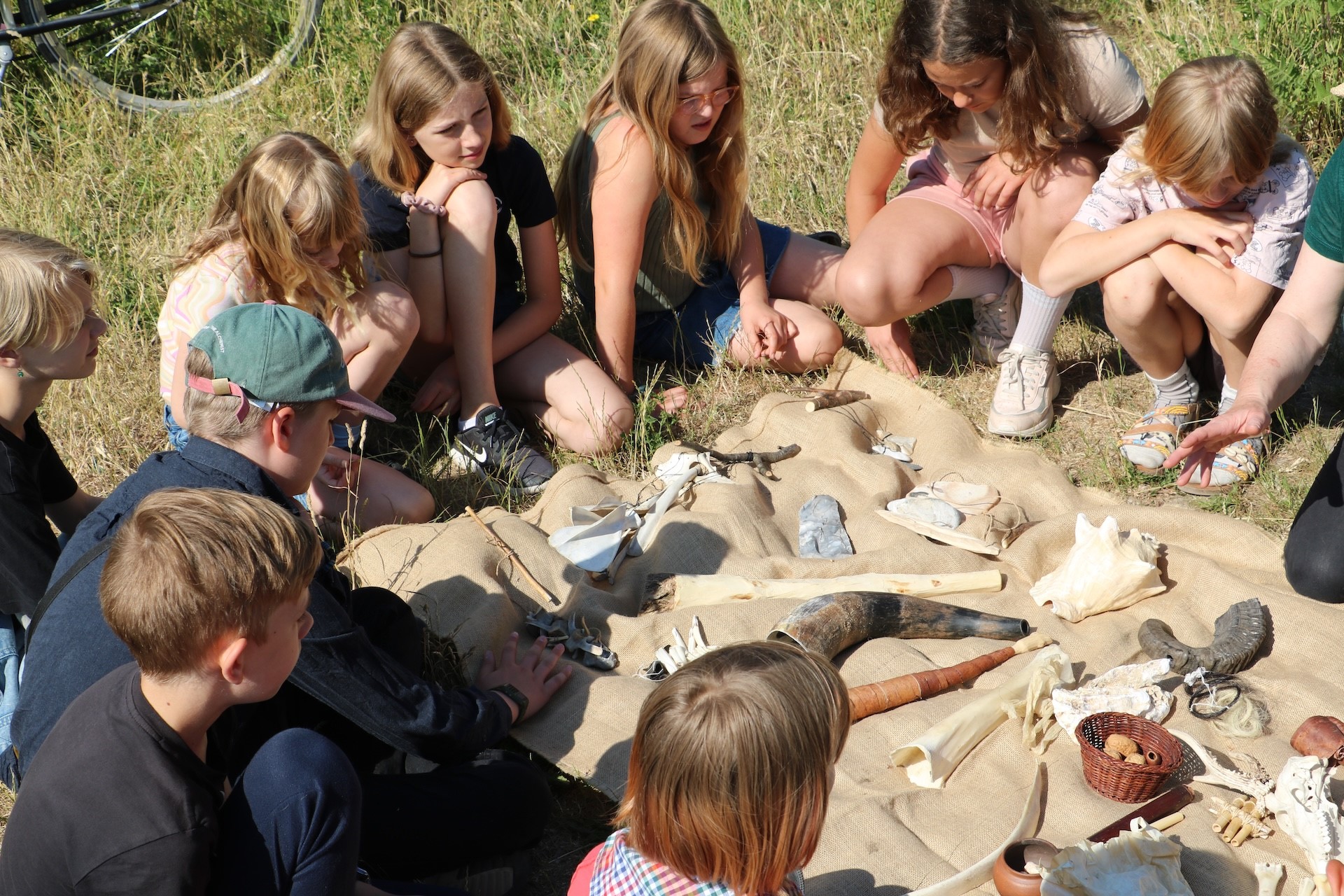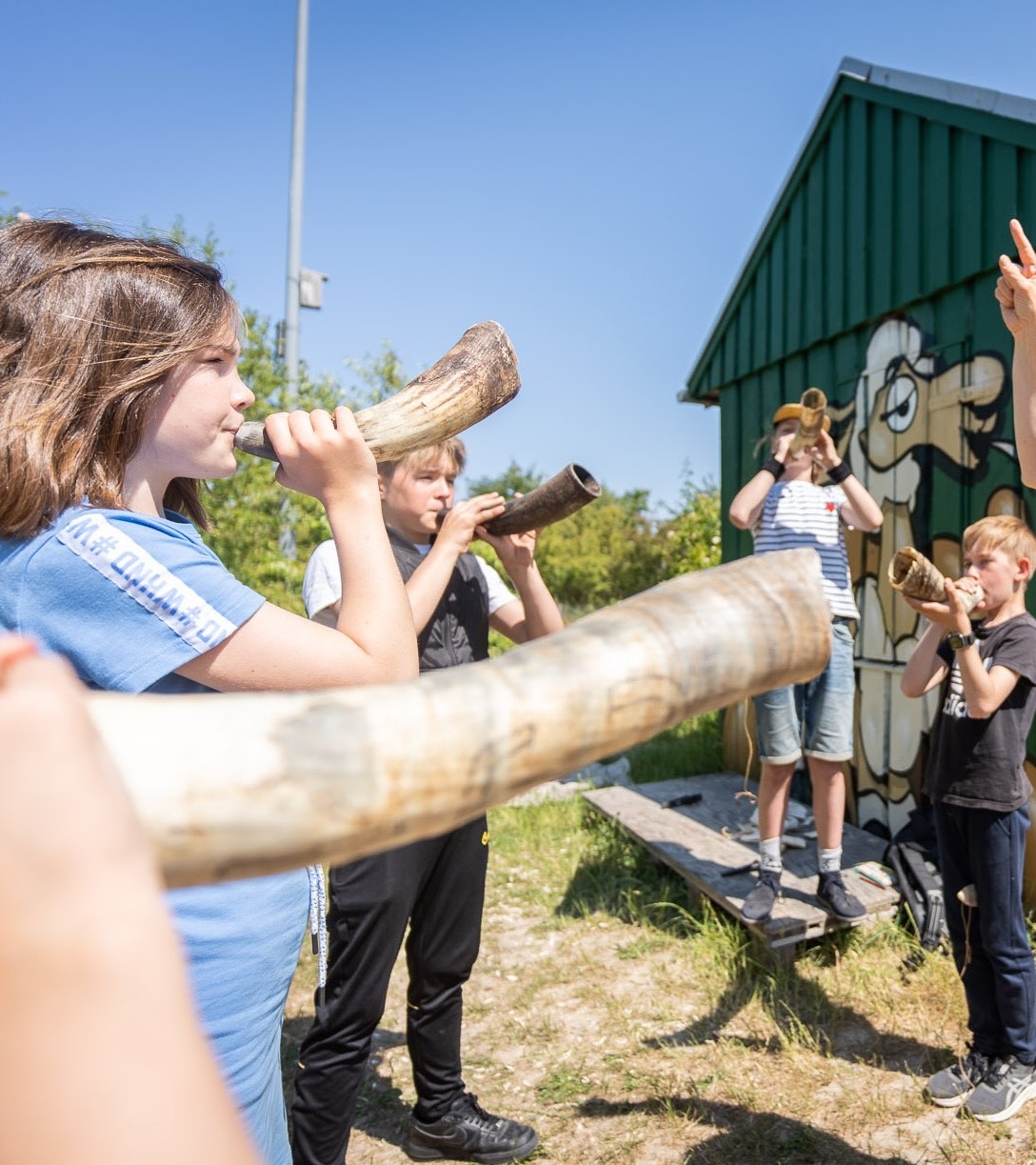 Jeg medbringer materialer og eksempler som eleverne kan prøve. Inspireret af fund fra oldtiden laver vi egne instrumenter, vi taler om materialerne og om hvad vi måske brugte musik til dengang. Vi prøver at imitere naturens lyde, opfinder signaler, forestiller os lyden af et ritual og får jorden til at ryste, når vi alle blæser i dyrehorn.